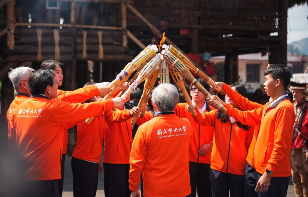 鄒族長老依循傳統祭儀點燃象徵祖靈祝福的文化之火,傳遞給本屆全大運舉辦學校國立中央大學蕭述三校長,為本屆賽會揭開序章。(運動部提供)