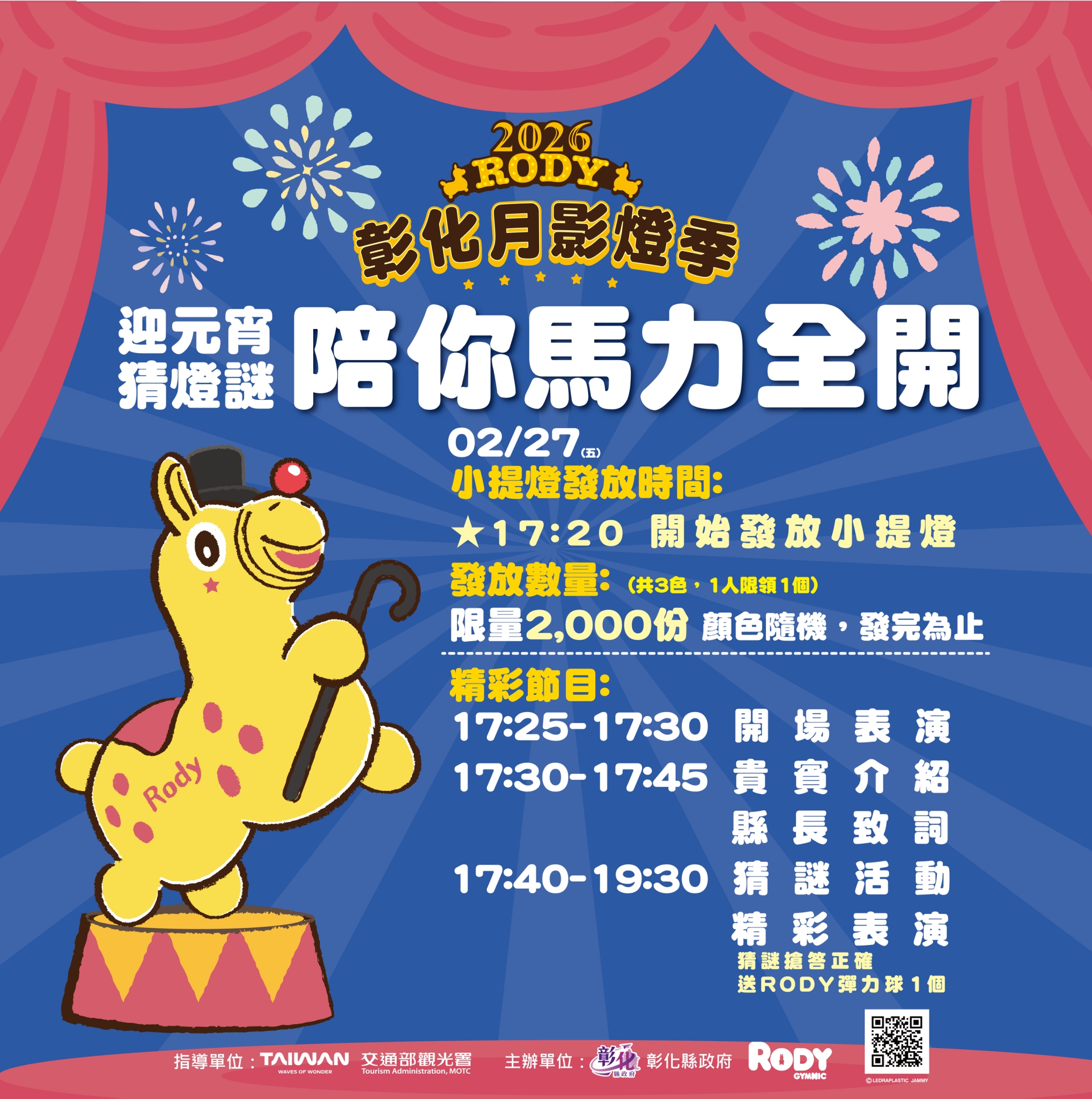 活動當日下午五時二十分起,現場將限量發放二千個跳跳馬Rody IP紀念小提燈(含隱藏款黃色),數量有限、送完即止,是本屆燈季最後一次發送提燈。提醒民眾提早到場排隊,把握最後收藏機會,與親友一同提燈漫遊燈區,隨後參加「元宵猜謎,馬力全開」活動。現場規劃許多與「馬」相關的趣味燈謎,邀請大小朋友動腦拚手速、挑戰反應力,在熱鬧互動與歡笑聲中感受燈會的熱情氛圍,搶答正確就送Rody彈力球一個。