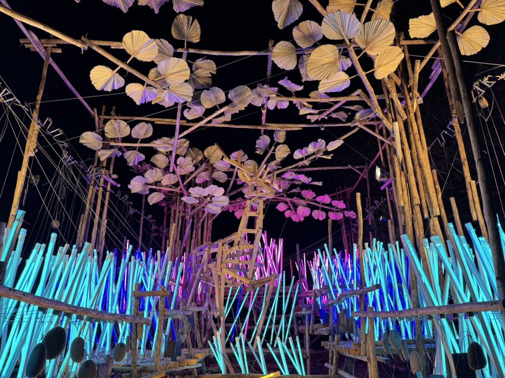 在整體光環境規劃上,這屆策展思維更趨成熟,山林不再只是作品的背景,而是主動發聲的展演場域。光環境作品《聲波》以超過一百五十支光環燈條環繞虎形山公園,透過節奏與流動感,讓森林成為創作的一部分,形塑山林與光影共構的空間敘事。