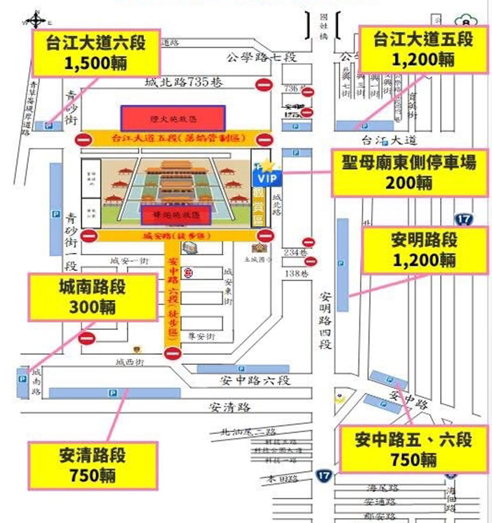 三分局指出,聖母廟周邊安明路、台江大道、安中路及公學路等路段可能出現壅塞。國姓橋南下車輛,由公學路、台江大道進入城北路,往青草崙堤防至台江大道六段停放。安明路北上車輛,由安清路右轉城南路段停放。