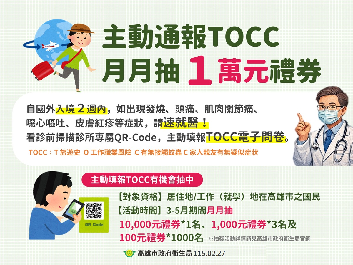 衛生局表示,高雄市為海空雙港大城,鼓勵民眾在候診時更主動透過手機填寫TOCC(旅遊史、職業別、接觸史、群聚史),協助醫師診斷登革熱等傳染病,以達早期診斷及早治療。