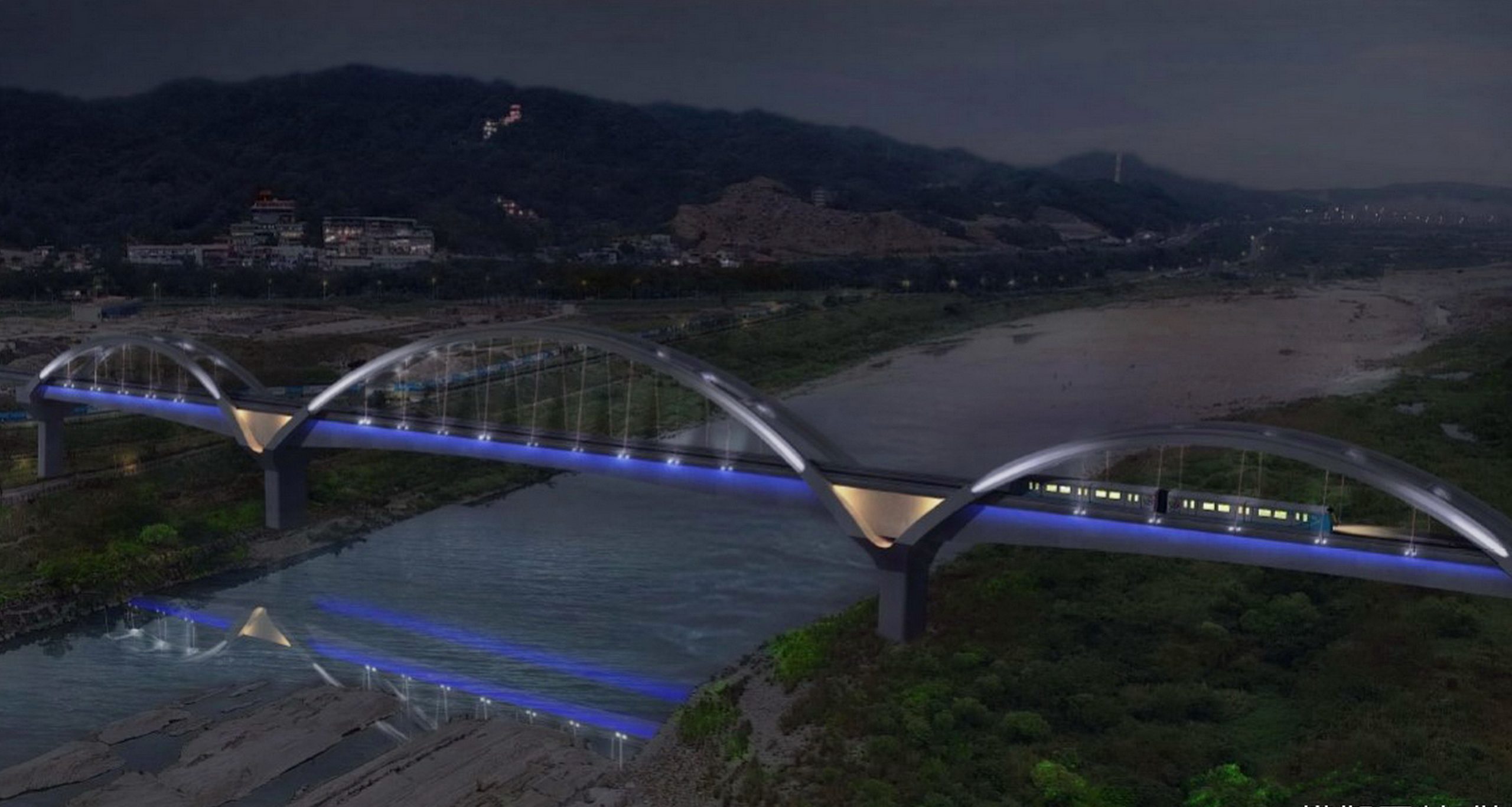 捷運局長李政安表示,捷運三鶯線大漢溪鋼拱橋,位於台北大學站與鶯歌車站之間,是連續三拱鋼構設計,規劃規律的光影變化象徵河川呼吸的節節奏感,以橋拱之姿、藍映水影、三鶯榮耀等燈光特效及時段控制,把橋梁的「力」與「美」徹底展現,凸顯橋梁整體光影變化結構美學,預計於通車時同步啟用。