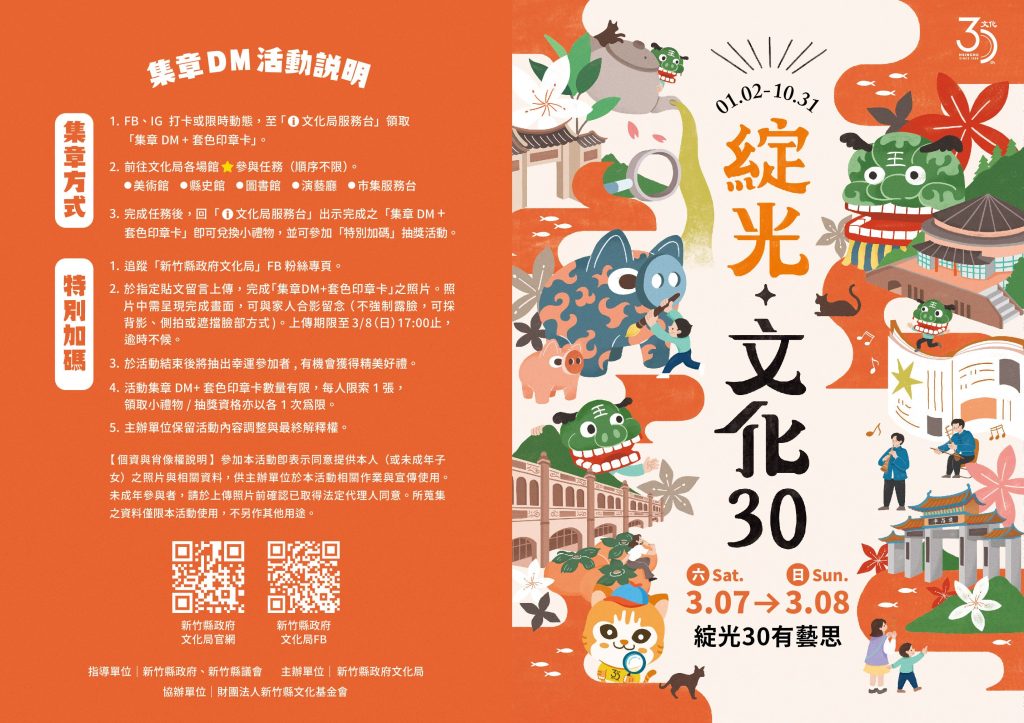 慶祝新竹縣政府文化局成立三十週年,文化局特別規劃系列活動,三月四日開鑼的「綻光三十」藝文人士餐敘,邀在地客家主廚精心設計的特色料理餐盒及多元藝文表演,款待來自各界藝文人士。三月七、八日兩天「綻光三十有藝思」局慶系列活動於文化局園區登場。