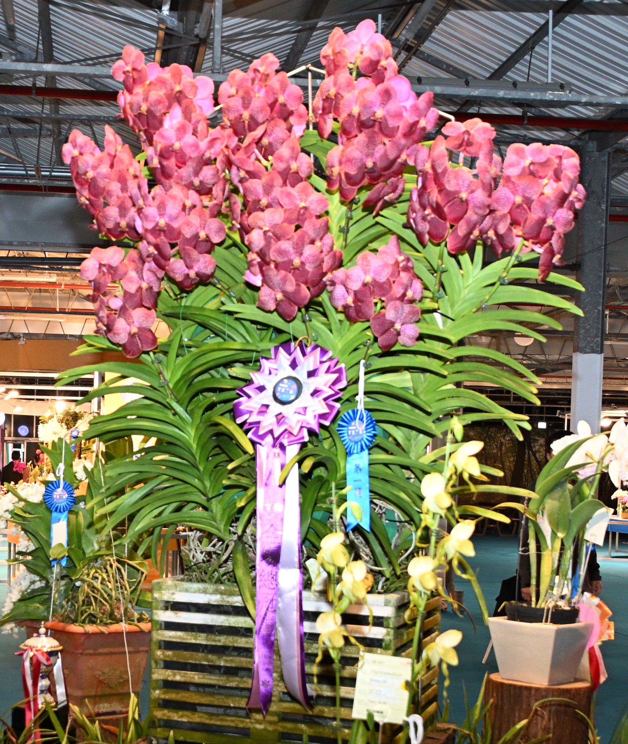 台灣蘭協評審團指出,此植株花序繁盛壯觀,排列層次分明,氣勢開展如冠冕鋪陳;花色深邃濃郁,宛如紅酒絲絨,質感厚實而富光澤,斑點細緻均勻,展現極高的花面完成度與視覺張力。花型飽滿端正,比例勻稱,整體觀感沉穩而大器。其葉姿見狀挺拔,線條流暢,根系盤結有力,充分展現成熟植株之生長勢與栽培功力。整體株型結構完整,動靜之間兼具宏偉氣勢與精緻細節。經評審團一致肯定其品系穩定度、開花整齊度、觀賞表現與國際舞台辨識度,為年度指標之作,授予全場總冠軍之殊榮。