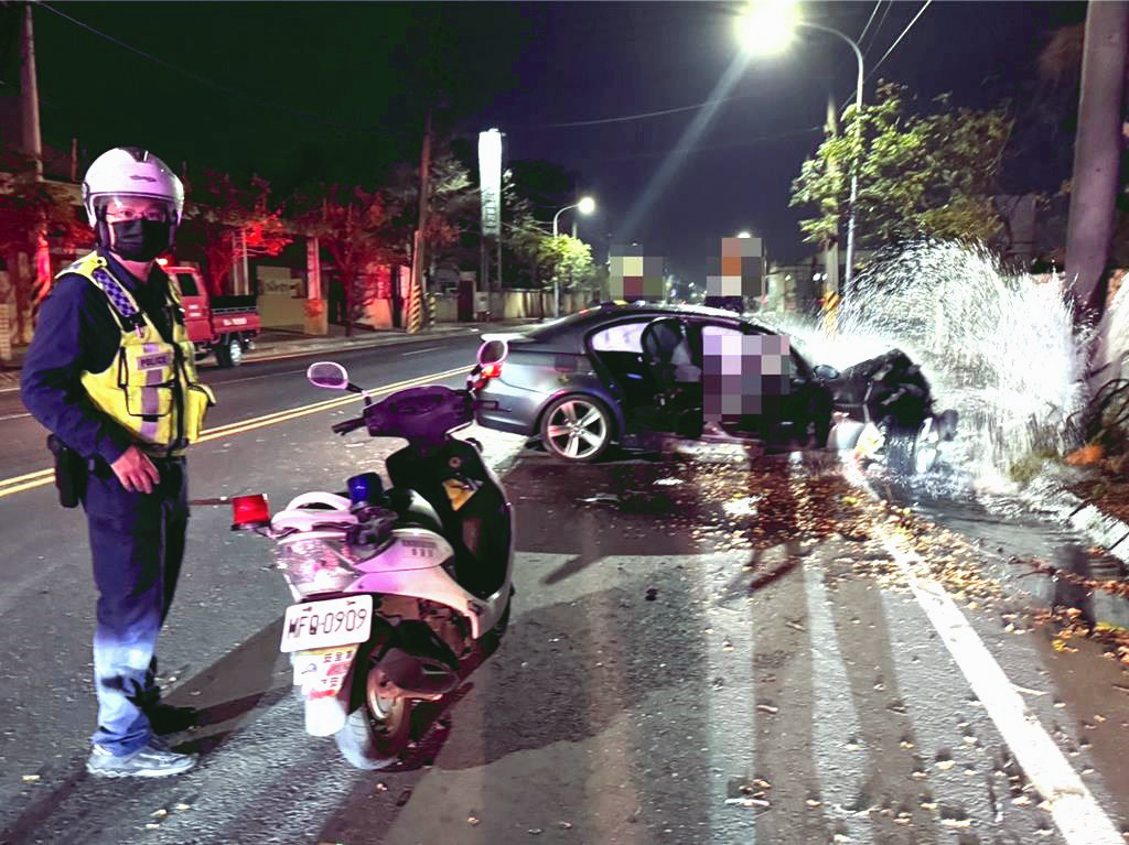 警方調查,一輛灰色BMW轎車於27日晚間9時27分行經燕巢區中安路時,不明原因向右側偏離車道,失控猛力撞擊路邊消防栓,強大撞擊力道不僅導致車頭全毀,車內安全氣囊完全爆開,更造成消防栓當場斷裂,不斷噴水,