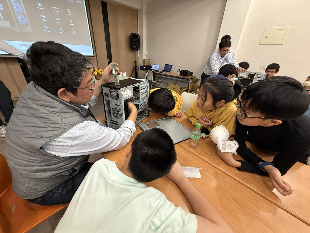 十五名孩子們圍繞在電腦主機旁,在工程師團隊耐心引導下,孩子們逐步認識CPU、GPU、主機板、記憶體(RAM)、電源供應器與散熱系統等核心元件,了解各零件的功能與運作原理,課程採實作方式進行,孩子們親手拿起螺絲起子,小心拆解零件,再一一組裝回去。