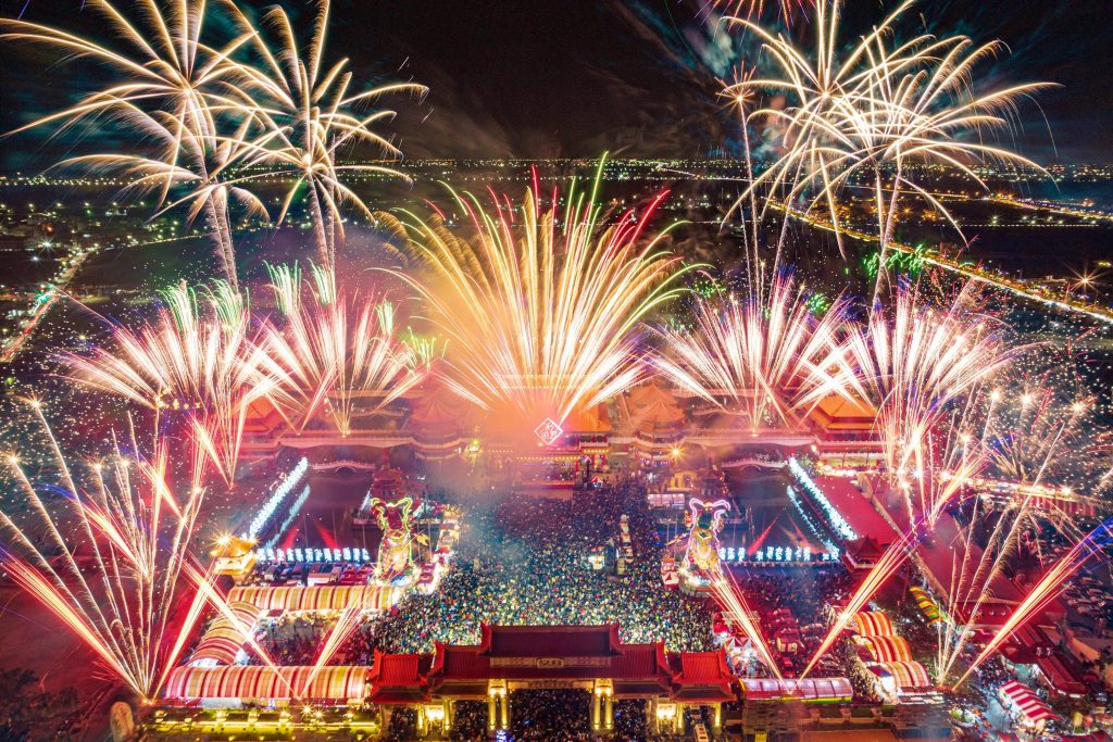 高空煙火、炸蜂炮分為五個階段施放,夜空花團錦簇,十二吋煙火彈綻放的煙花半徑達一百五十公尺,也有拖著尾光的「炸彈開花」,不時在夜空中驚爆,並搭配無人機匯演,透過多層次的光影變化,帶來耳目一新的視覺饗宴。