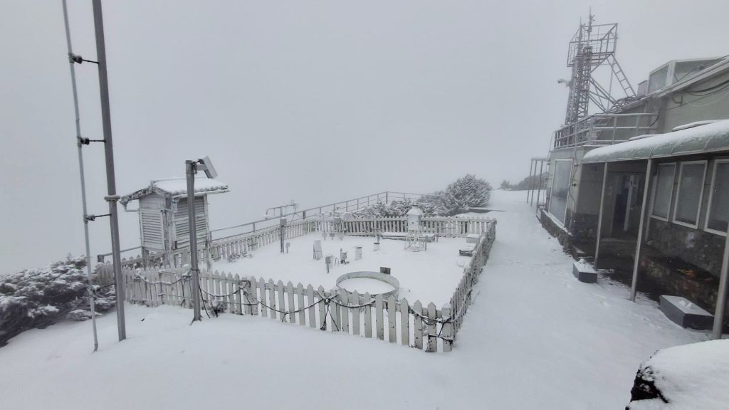 玉山氣象站昨上午七時十分降雪,十時雪深已達四公分,目前持續降雪中。(氣象署提供)