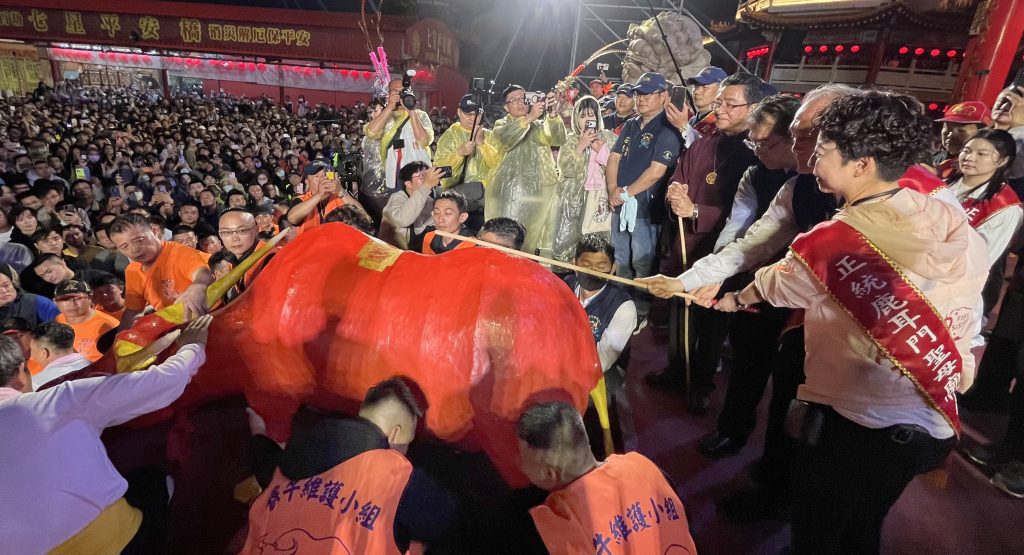 正統鹿耳門聖母廟丙午年春節系列活動,「迓春牛」是重頭戲之一,二十八日晚間由市長黃偉哲、立委陳亭妃、聖母廟主委鄭深池鞭春牛,「鞭春讚」之後開放搶春牛,相傳搶得春牛得以逢凶化吉,轉眼間就搶得精光。