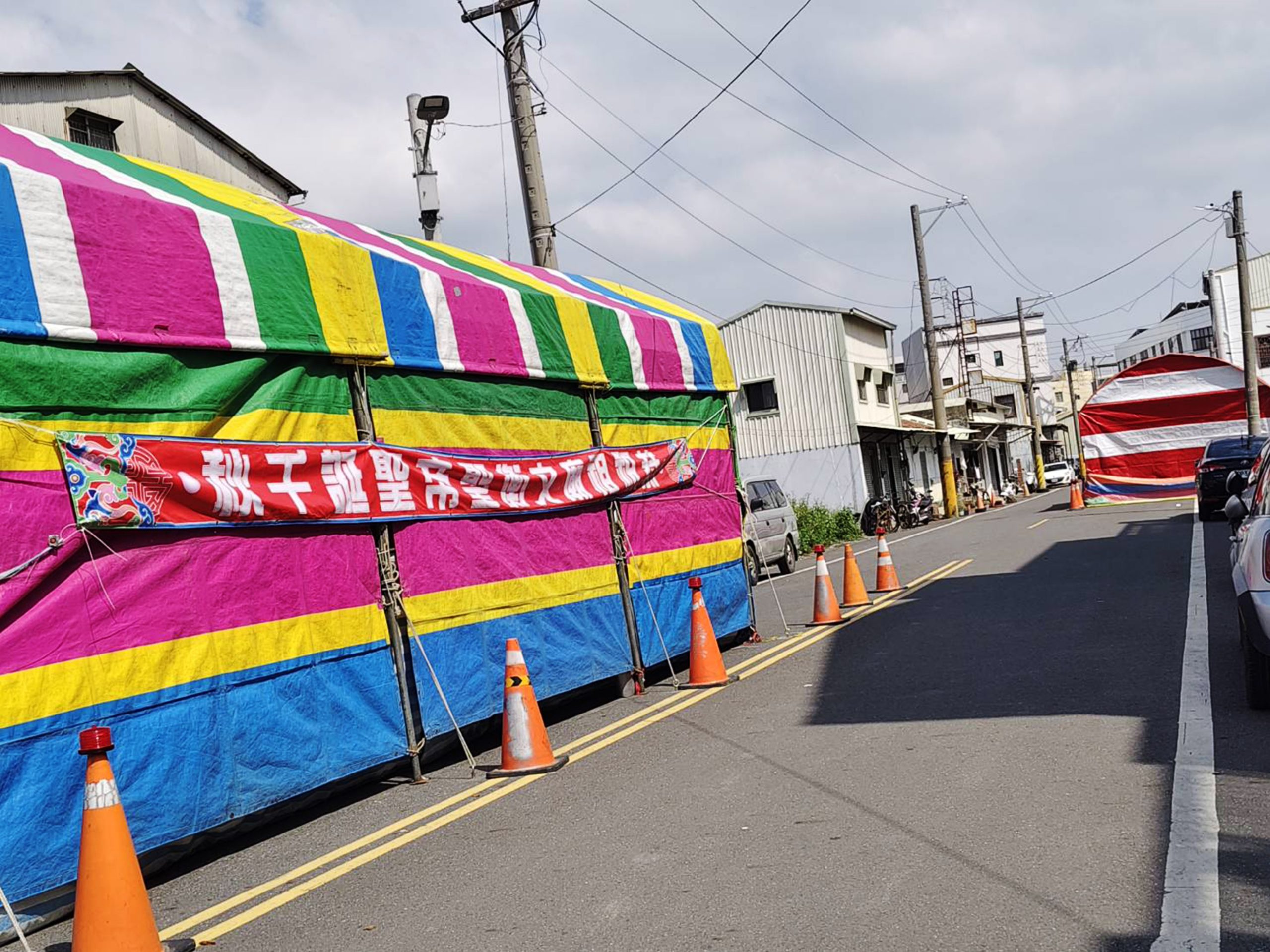 鹽水街道上可看見以帆布圍起來的炮城。(記者陳佳伶攝)