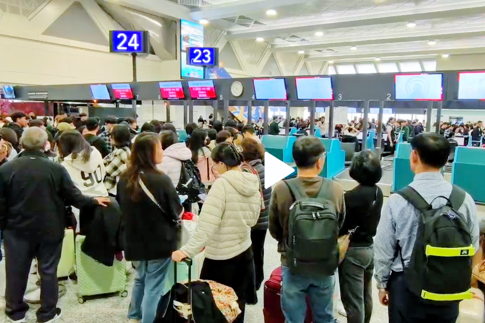 桃園機場早上九時許突然發生無法報到狀況,排隊旅客表示,「已經等候很長的時間」,一開始都沒有任何人說明狀況,後續才有地勤人員張貼手寫公告,並出面說明「各櫃檯的報到系統都已經當機,請旅客耐心等候」,旅客才知道系統當機。