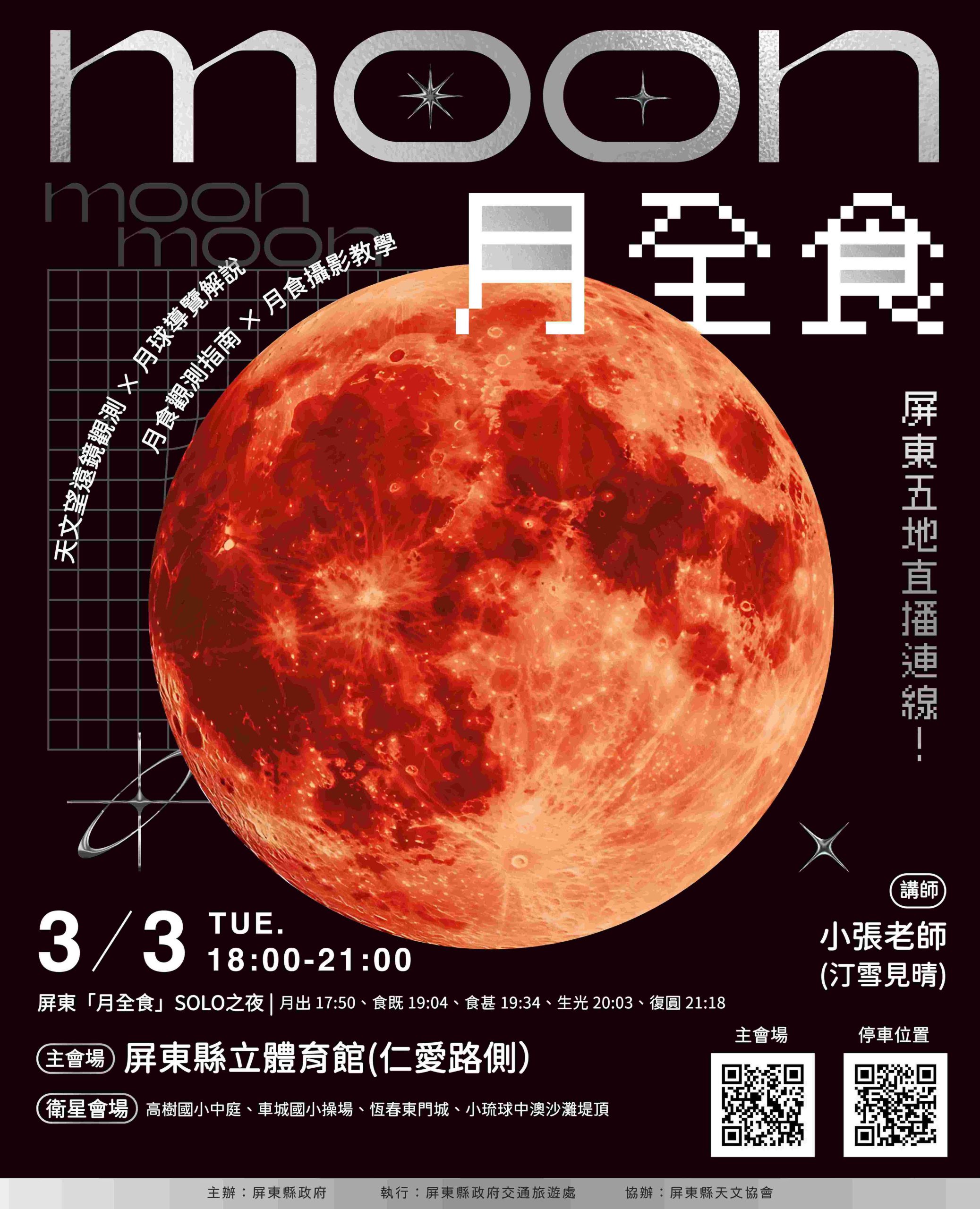 交旅處說,位於屏東縣立體育館的主會場,活動將於當晚18:00正式展開。現場除了邀請星空大使施世治老師進行專業月全食導覽外,更規劃多樣化互動內容,包含月球解說與導覽(深入淺出認識月全食成因與月球奧秘)、有獎徵答互動(增加天文知識的趣味性)、天文望遠鏡觀測(現場提供專業設備,近距離觀察暗紅色的月球)、月食攝影教學(指導民眾如何用手機或相機捕捉最美的紅月瞬間)。