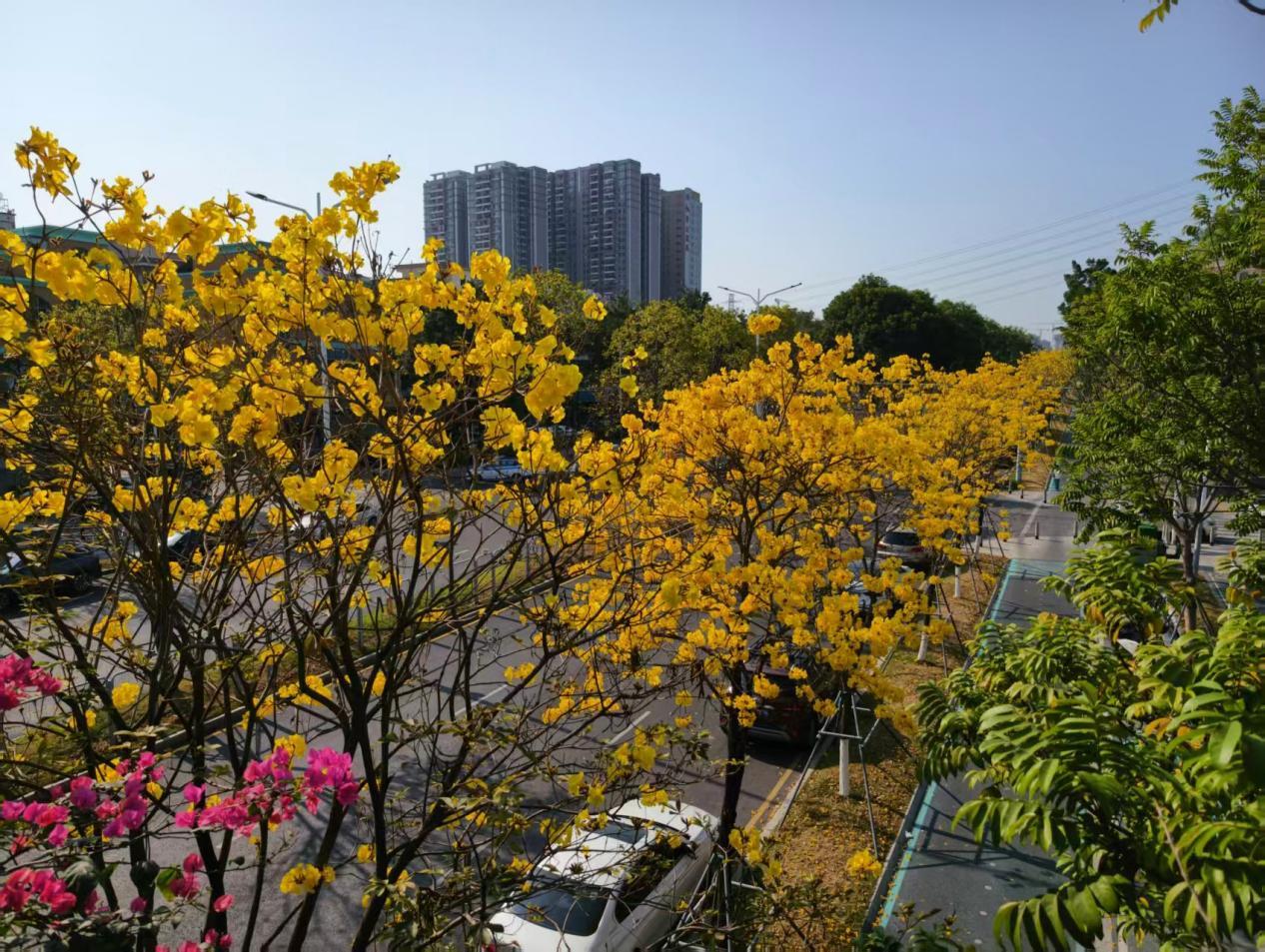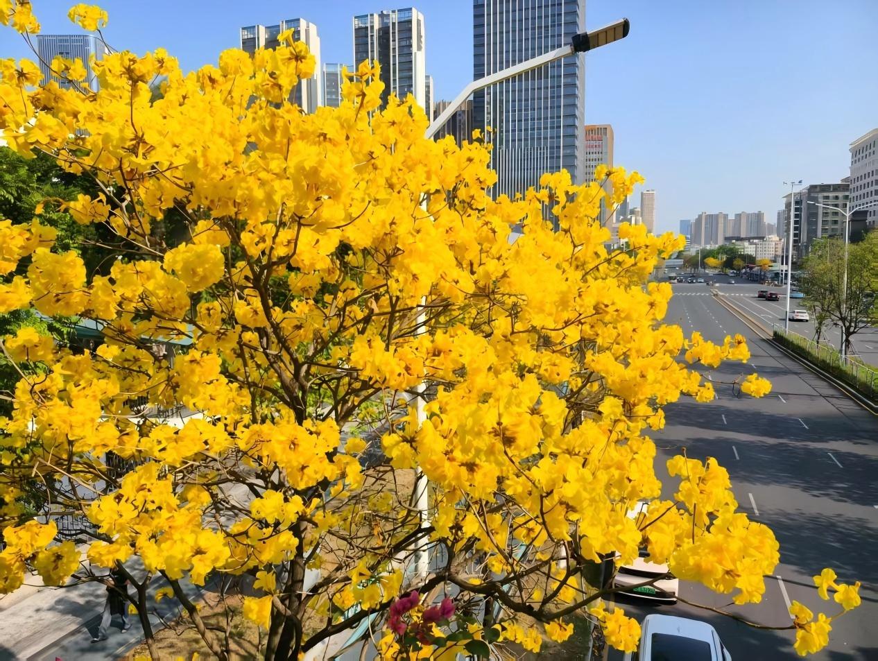 南國風暖花開成海,深圳市寶安區西鄉街道兩側的黃花風鈴木迎來一年中最燦爛的時節,綿延約六公里的花樹次第綻放,金黃如潮,為城市披上一層明亮的春色。