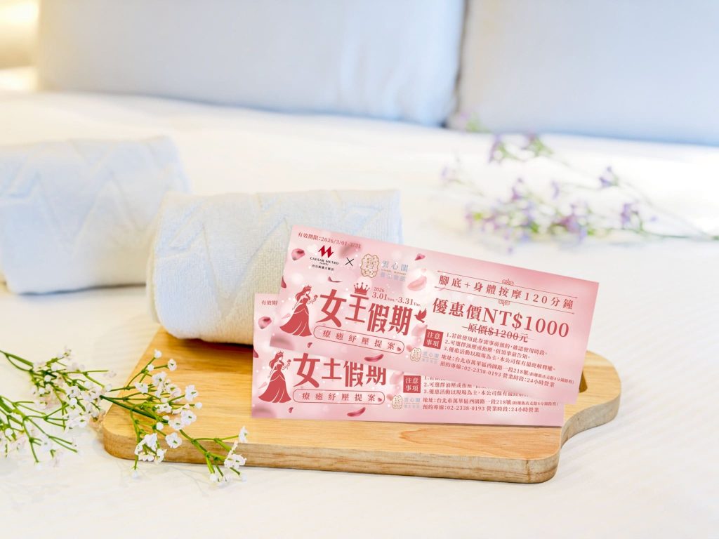 台北凱達大飯店「女王假期 療癒紓壓住房專案」每晚2,538元起,加贈萬華雲心閣養生會1,000元優惠券。圖/凱撒飯店連鎖提供