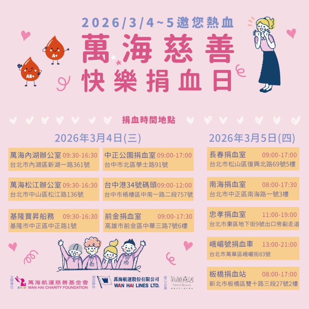 2026年「萬海慈善快樂捐血日」將於3月4日、5日,在北部、中部及南部地區共計11個據點開跑,邀請民眾以及萬海航運北、中、南營運據點同仁,挽袖獻愛心,熱血接力紓解血荒。您捐出的每一袋血,能為急需用血的患者帶來重生契機,也有助於促進新陳代謝,是一項利己利人、溫暖社會的善行。