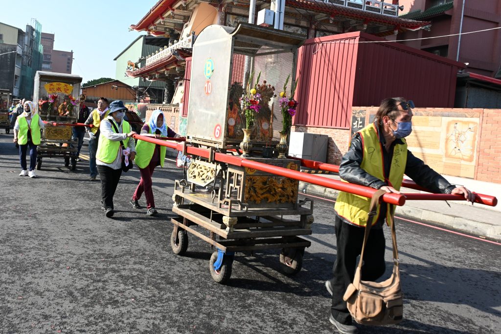 隨後鎮南宮周倉爺神轎為先鋒,帶領各廟宇神轎與陣頭從舊岸內展開兩天兩夜的遶境。黃偉哲也搭上神轎花車撒糖果,沿途向民眾揮手致意,祈求神明庇佑台南平安、大家身體健康、萬事如意。