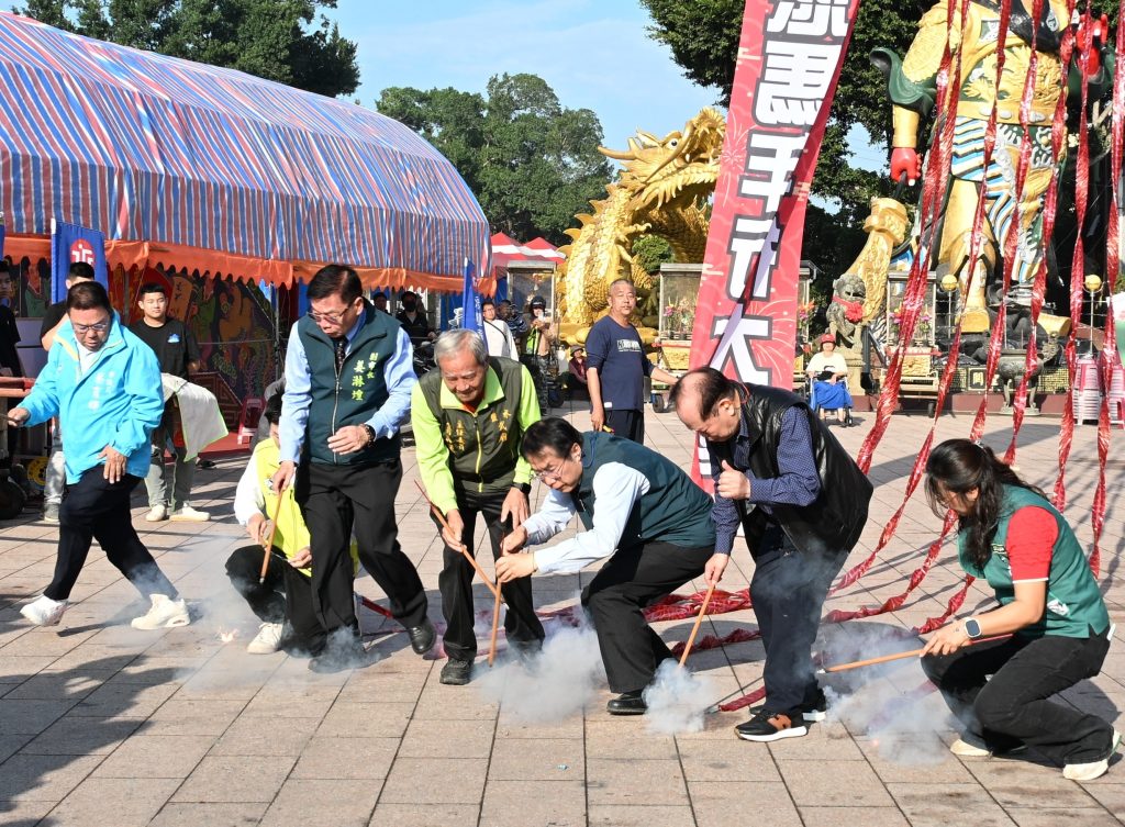 黃偉哲三月二日上午八點抵達鹽水武廟後,由副市長兼民政局長姜淋煌與鹽水區長陳文棋陪同,一起向關聖帝君上香祭拜。武廟安排大師林暉現場揮毫寫下「蜂炮盛、台灣升」的祝福春聯,邀請黃偉哲與市議員蔡育輝、王宣貿、沈家鳳等人點燃由起重機載著長串連珠炮盤旋升空,為今年的神轎遶境儀式啟炮。