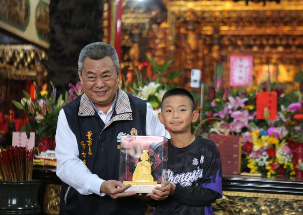 高雄鳳山文衡殿擲筊活動,十歲學童抱回五十萬元「金關帝」 。(記者許正雄攝)