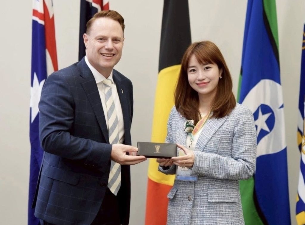 許采蓁三日發文表示,她和議長康裕成及議會夥伴飛越七千公里抵達布里斯本市政廳,和他們針對河道及港口經濟深度交流。