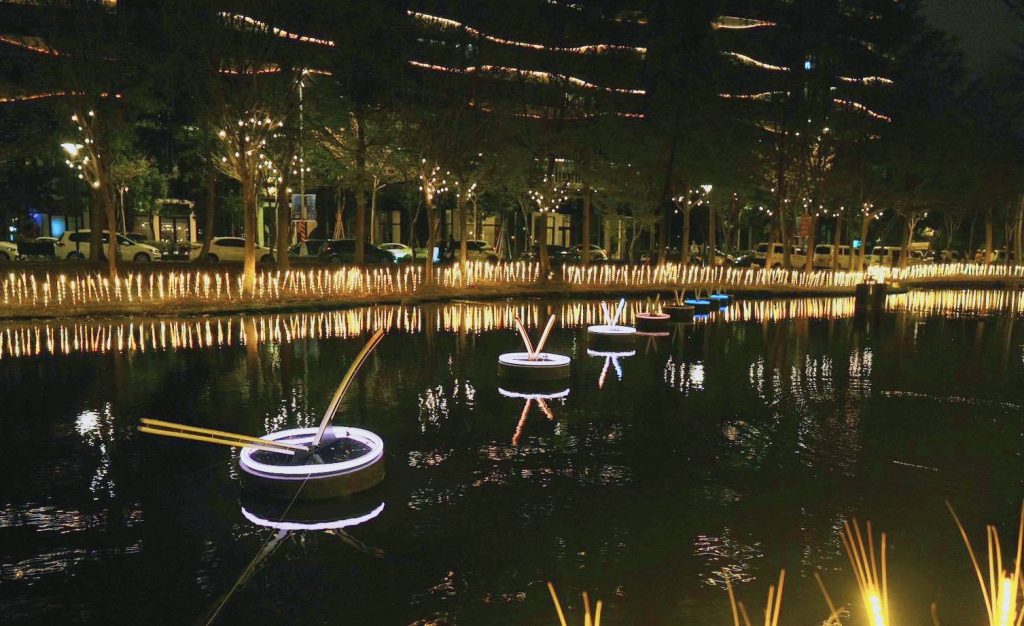 民眾可沿著木棧道巡覽後續主題展區,「穿影之川」位於湖畔的菶菶由李宸安創作,打造生態方舟。黑川互動媒體藝術團隊打造的第二主燈「光築吟風」。此永續燈座透過雷射投影在水霧中具象,展現城市「於風中站立,於光中築夢」生生不息的能量,首次在大新竹出現,引發社群熱烈討論。接續前行,則能看見謝秉祐創作的徵件作品「繁月迴光」,透過月盤擺動展現時間潮汐與月相盈虧。