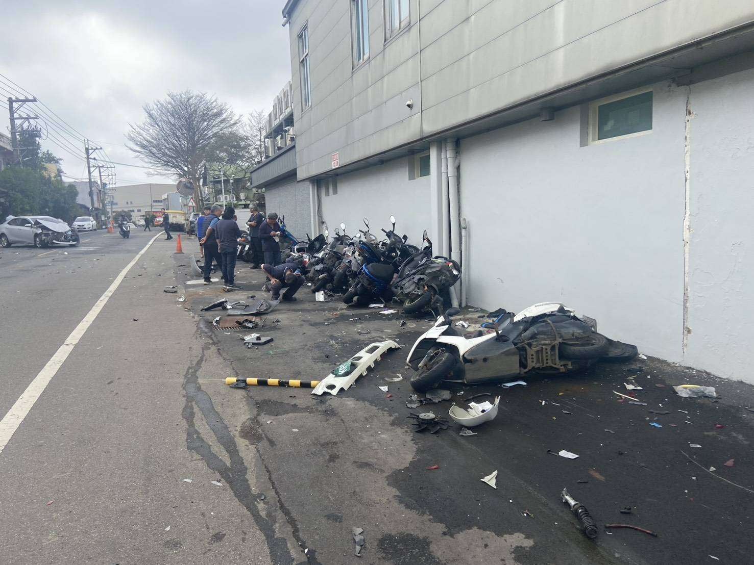 桃園市觀音區今(2)日上午10時許發生一起車禍,一名56歲彭姓女子駕駛自小客車於富源六路欲左轉新富路,與30歲鄭姓男子駕駛的直行小貨車發生碰撞,小貨車失控向左偏移,撞上停在路邊的17台汽、機車,其中一台汽車被「擠上」其他車輛的車頂,形成「疊羅漢」的畫面,多台機車也骨牌式傾倒。大園警分局獲報立即到場處理,所幸該起事故並無造成任何人員傷亡。