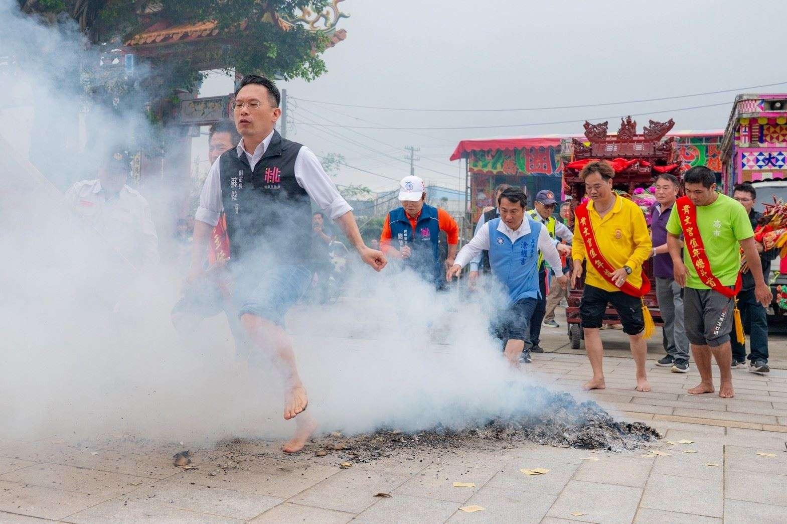 蘇俊賓表示,三年前首次參與過火時心情略顯緊張,當時內海里里長許程睿在旁鼓勵「跟著做就對了」,讓他順利完成儀式;隨著年年參與,如今再次踏上火堆,在九府王爺與夫人庇佑下,內心更顯平靜與安定。今年除主委徐其萬及貴文宮團隊外,立委涂權吉與青峰里里長劉秋霞也陪同赤腳過火,展現地方共同守護信仰的凝聚力。蘇俊賓指出,大園內海貴文宮為全台唯一供奉九府千歲的廟宇,每年正月十四舉行遶境活動,象徵信仰延續與地方向心力。他也感謝廟方及地方人士長年守護百年儀典,讓傳統文化在現代社會持續傳承,成為社區凝聚的重要核心。