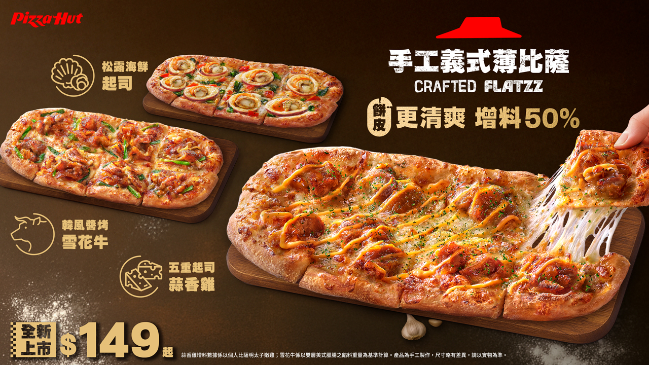 必勝客去年引領個人比薩新風潮首創推出「手工義式薄比薩」,一上市就憑藉極致口感創下每20秒賣出1份的驚人銷售紀錄,即日起,必勝客正式宣布重磅回歸!本次不僅延續職人手工拉製的27公分橢圓造型餅皮,更帶著餡料豪邁加量50%的誠意,一口氣發表三款新口味:由五種濃郁起司領銜的「五重起司蒜香雞」與充滿韓式甜辣魅力的「韓風醬烤雪花牛」,單點嚐鮮價僅需149元;而首度加入奢華食材的「松露海鮮起司」則以159元帶來星級享受。無論是起司控、韓風迷還是海鮮饕客,現在只要打開PK APP預訂,省時美味不用等,在家也能隨時享受這份清爽不油膩、份量更飽足的職人比薩。
