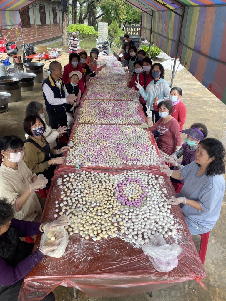 大社東勢北極殿志工搓出五行湯圓,免費讓大家嚐。(記者張淑娟攝)