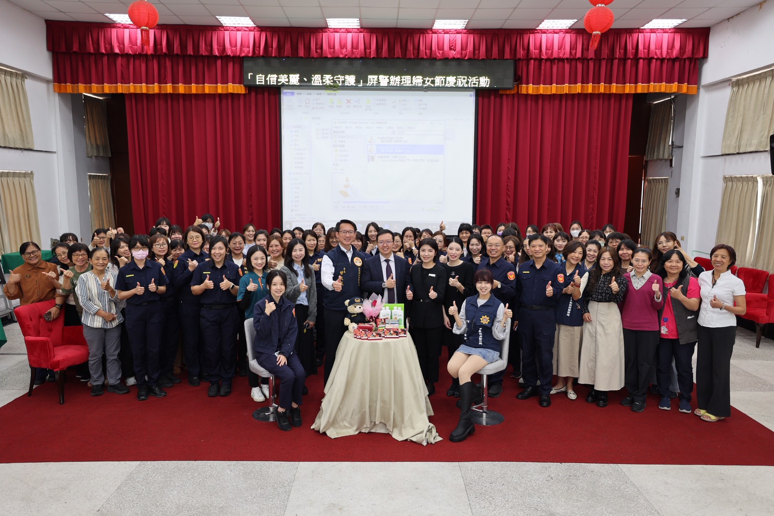 屏東縣政府警察局迎接三八國際婦女節的到來,5日舉辦一場別開生面的慶祝活動,特別結合熱心企業的溫暖贊助,由局長甘炎民代表致贈每位女性同仁專業眼影彩妝禮盒,更精心安排專業彩妝師進行示範教學,讓平時嚴肅的警局頓時洋溢著溫馨與知性的氣。