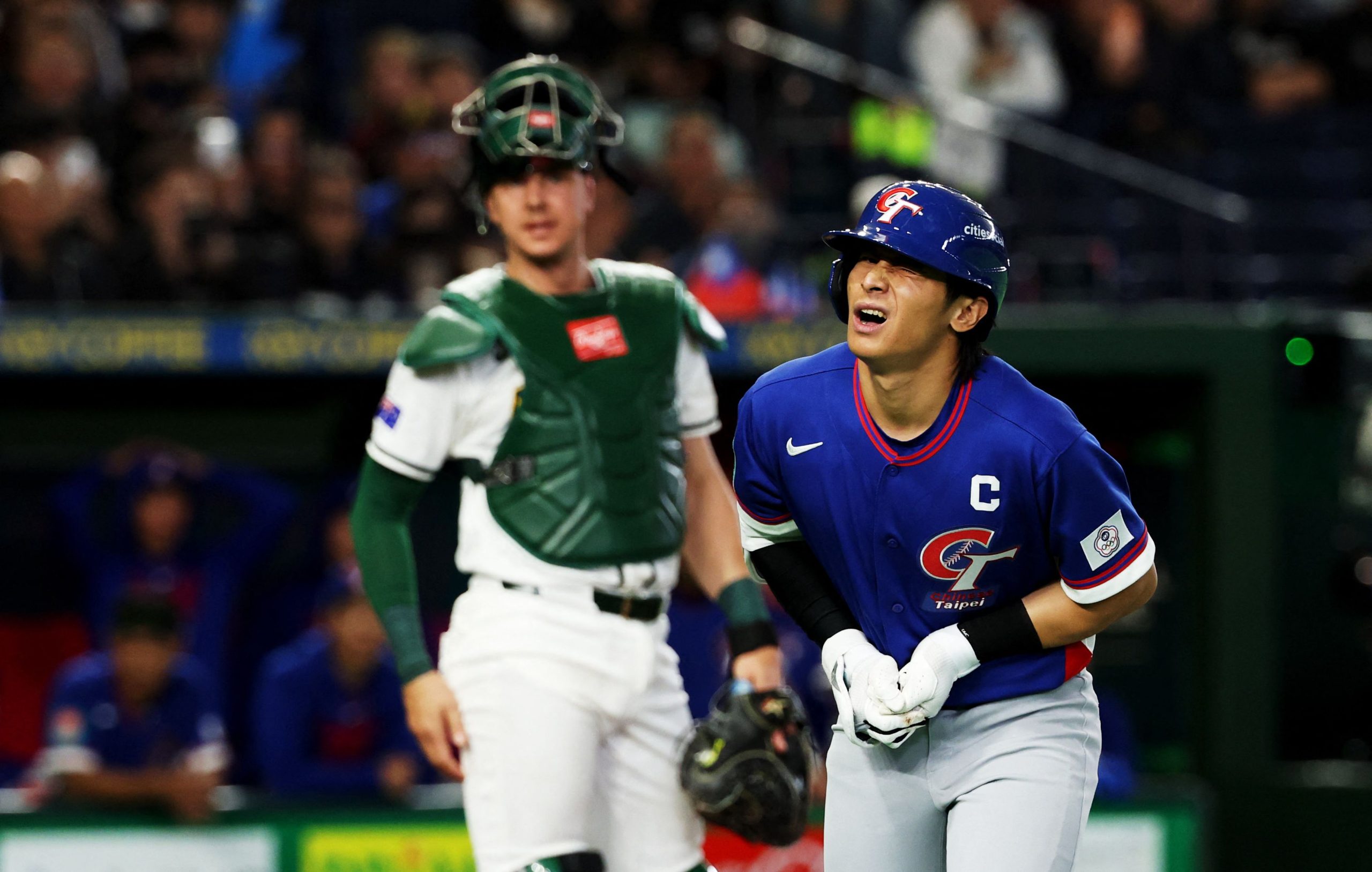 中華對澳洲6局上,隊長陳傑憲(前)遭觸身球擊中手部,表情痛苦。(路透)