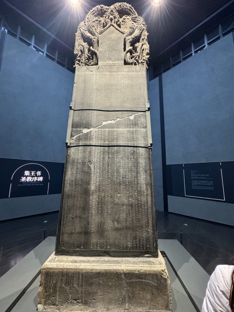 踏入碑林,最令人震撼的是碑亭內的唐代《石台孝經》,刻於唐玄宗天寶四年(西元745年),是碑林最具代表性的鎮館之寶之一。此碑由唐玄宗李隆基親自注書,宰相李林甫與國子祭酒李齊古主持鐫刻而成,整體由35塊巨石組合構成,高達590公分,氣勢宏偉,展現盛唐時期石刻藝術與皇家書法的最高水準。《孝經》為儒家重要經典,闡述孝道精神,而唐玄宗以帝王之尊親注經文,使此碑兼具思想、書法與歷史價值,也象徵中國傳統倫理文化的深厚底蘊。