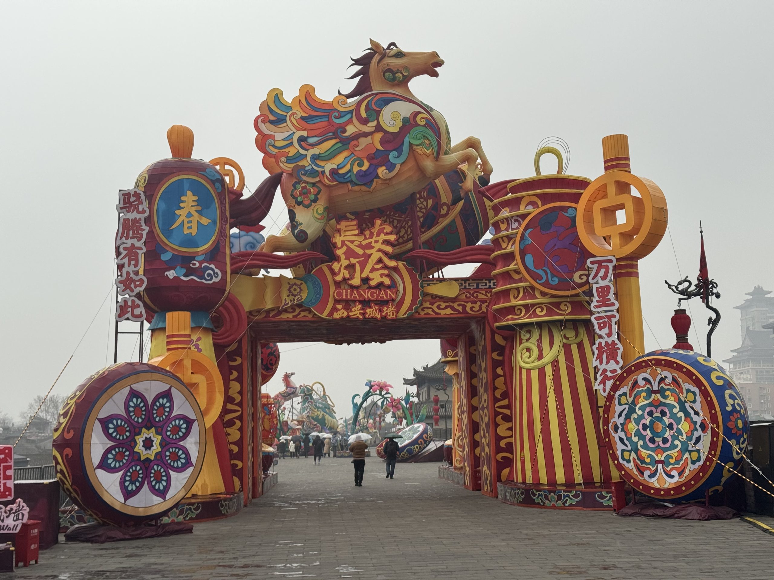 適逢新春時節,永寧門城牆上特別布置了大型花燈展示。各式造型燈組沿著城牆步道依序排列,融合傳統文化元素與現代設計語言,呈現出別具一格的視覺景觀。鮮豔的彩燈與厚重的城牆相互映襯,在古老建築的襯托下更顯靈動生輝,為這座歷史名城增添了濃濃的節慶氛圍。