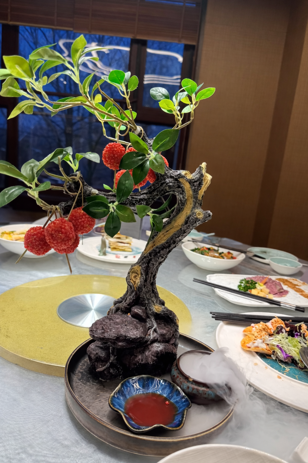 近期以盛唐為背景的電視劇《長安荔枝》正在熱播,不僅掀起觀眾對唐代宮廷文化的關注,也意外帶動西安餐飲界的創意風潮,西安宴席會場亦趕上這股熱潮,竟在餐桌上出現一株「長安荔枝樹」,紅豔欲滴的荔枝果實垂掛枝頭,搭配古樸樹幹造型與氤氳白霧點綴,彷彿將千年前的長安盛景搬上現代餐桌,讓人彷彿置身唐代宴會之中。