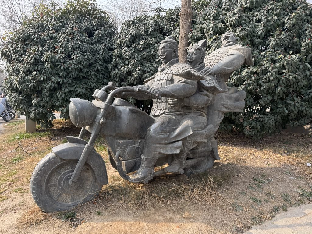 如果秦始皇的兵馬俑真的「復活」,他們會做什麼?在前往秦皇陵的路邊發現一座極具創意的雕塑,只見三名身穿古代鎧甲、神情嚴肅的兵馬俑,竟然騎著一輛造型霸氣的重型機車,彷彿準備衝刺出征,古今衝突的畫面讓人忍不住會心一笑。