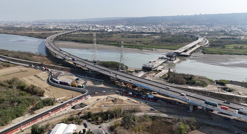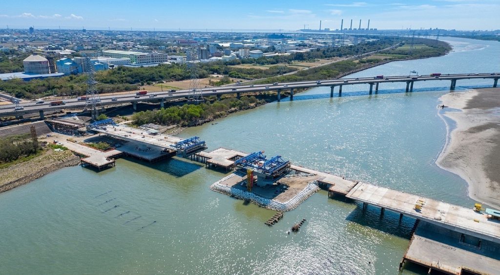 陳大田指出,工程北起大肚區文昌路,南接和美鎮台六十一乙線,全長約一千四百四十公尺、寬二十二公尺,規劃雙向四車道及二個機車專用道,並於下游側設置人行與自行車共用道,是中部地區近年規模最大的橋梁新建工程之一。自一一二年一月開工以來,歷經一一三年凱米颱風及一一四年七月底強降雨沖毀施工便橋等考驗,此外,面對臨水域高難度施工條件,施工團隊始終穩健展開深槽區懸臂節塊推進作業,整體進度持續穩定推展。