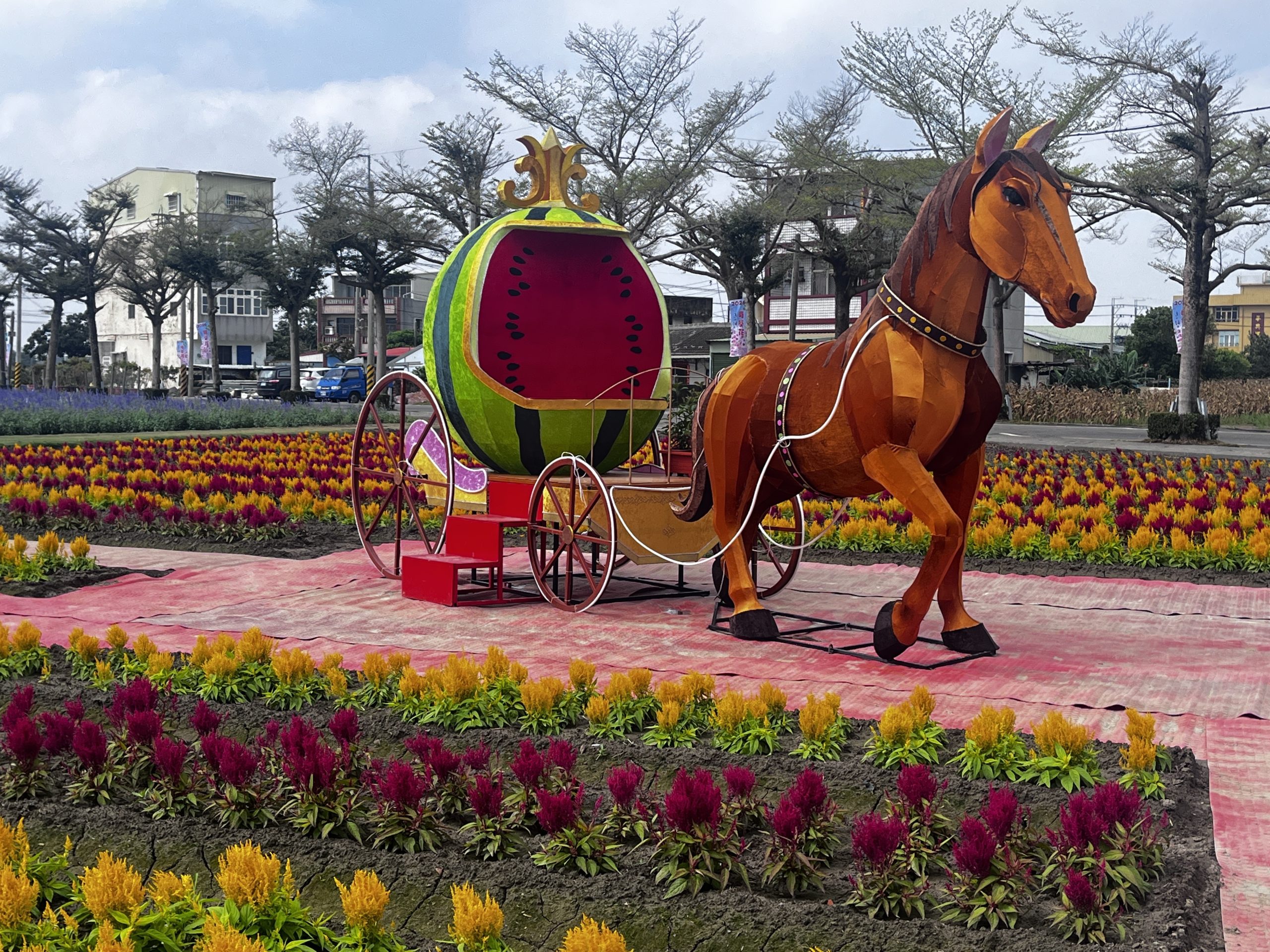 學甲區光華社區的蜀葵花海出現「西瓜馬車」!學甲區長張明寶指出,邁入第十三年的蜀葵花節十四日登場,配合馬年到來搭上學甲特產西瓜,超萌的西瓜馬車十分吸睛。