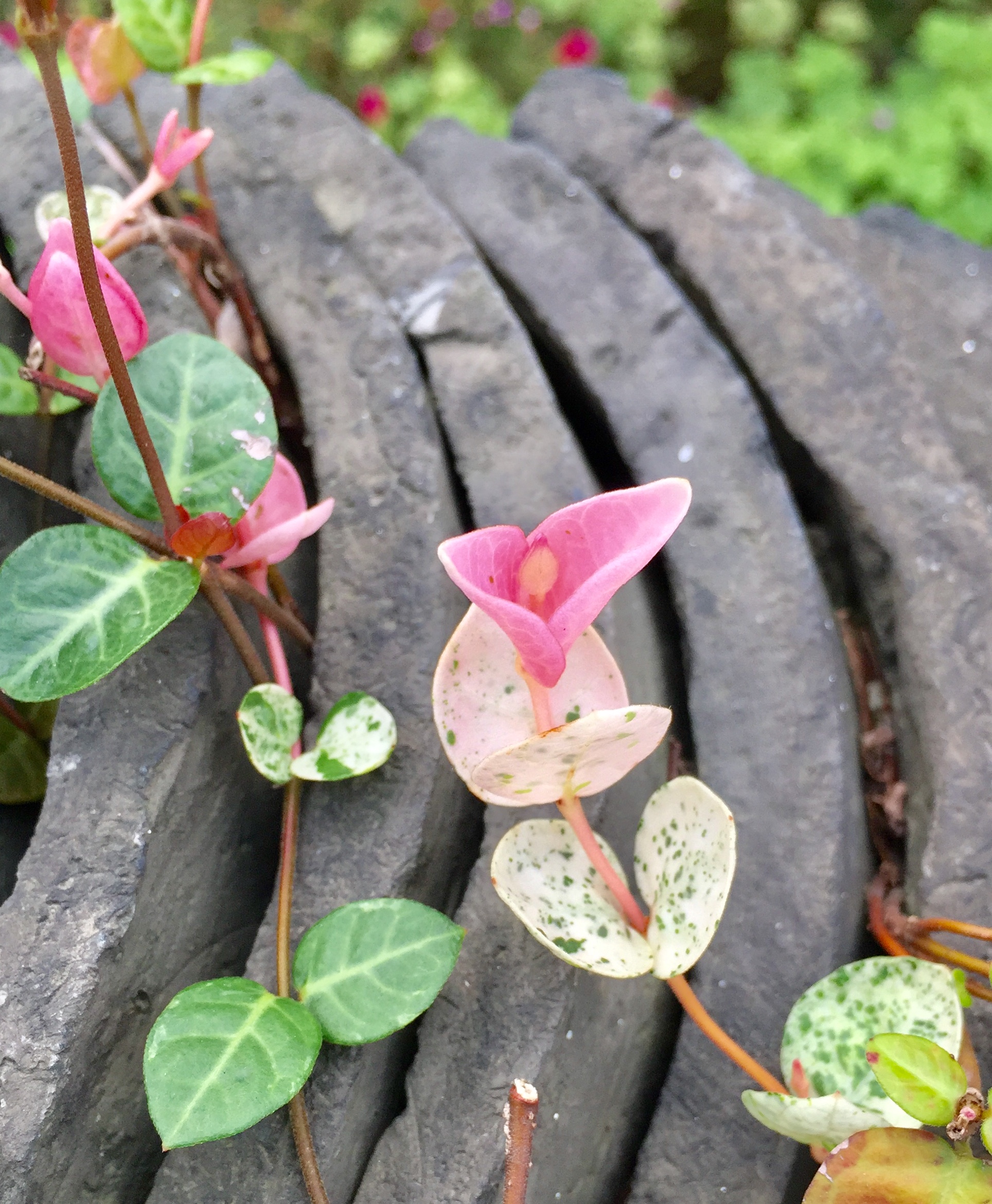 賞絡石,最美的是她的葉子。植物中,葉比花美的所在多有,絡石即是其中一種。絡石的嫩葉,剛生出時,如兩片向外開放的花苞,嫩嫩的紫紅色、粉紅色、鵝黃色……,色彩誘人,嫩葉新生幾天後,葉片上起了變化,生出許多斑點。葉子有各種顏色,斑點也有各種顏色,真是美的大集合!讓人賞心悅目!