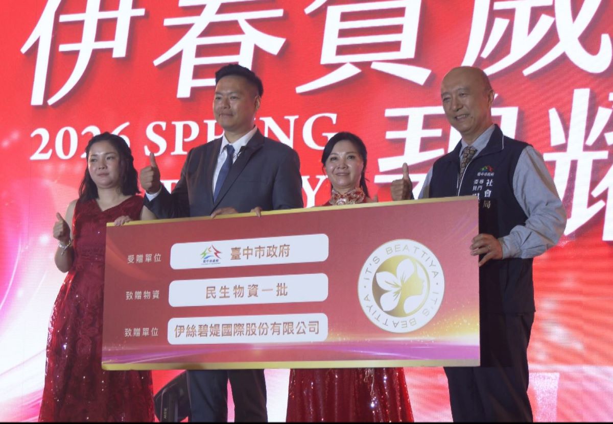 伊絲碧媞國際股份有限公司7日隆重舉行2026年春酒盛宴「伊春賀歲.碧耀新章」,同時舉行「全台公益接力」第38站物資捐贈儀式,捐贈儀式由台中市社會局專委吳文楦代表受贈,並對伊絲碧媞長期投入公益、持續以企業力量關懷社會表達高度肯定。伊絲碧媞不僅在專業領域深耕「美」,更在社會責任上實踐「真與善」,此次捐贈物資將精準投放至有實際需求的家庭,讓愛心資源發揮最大效益。