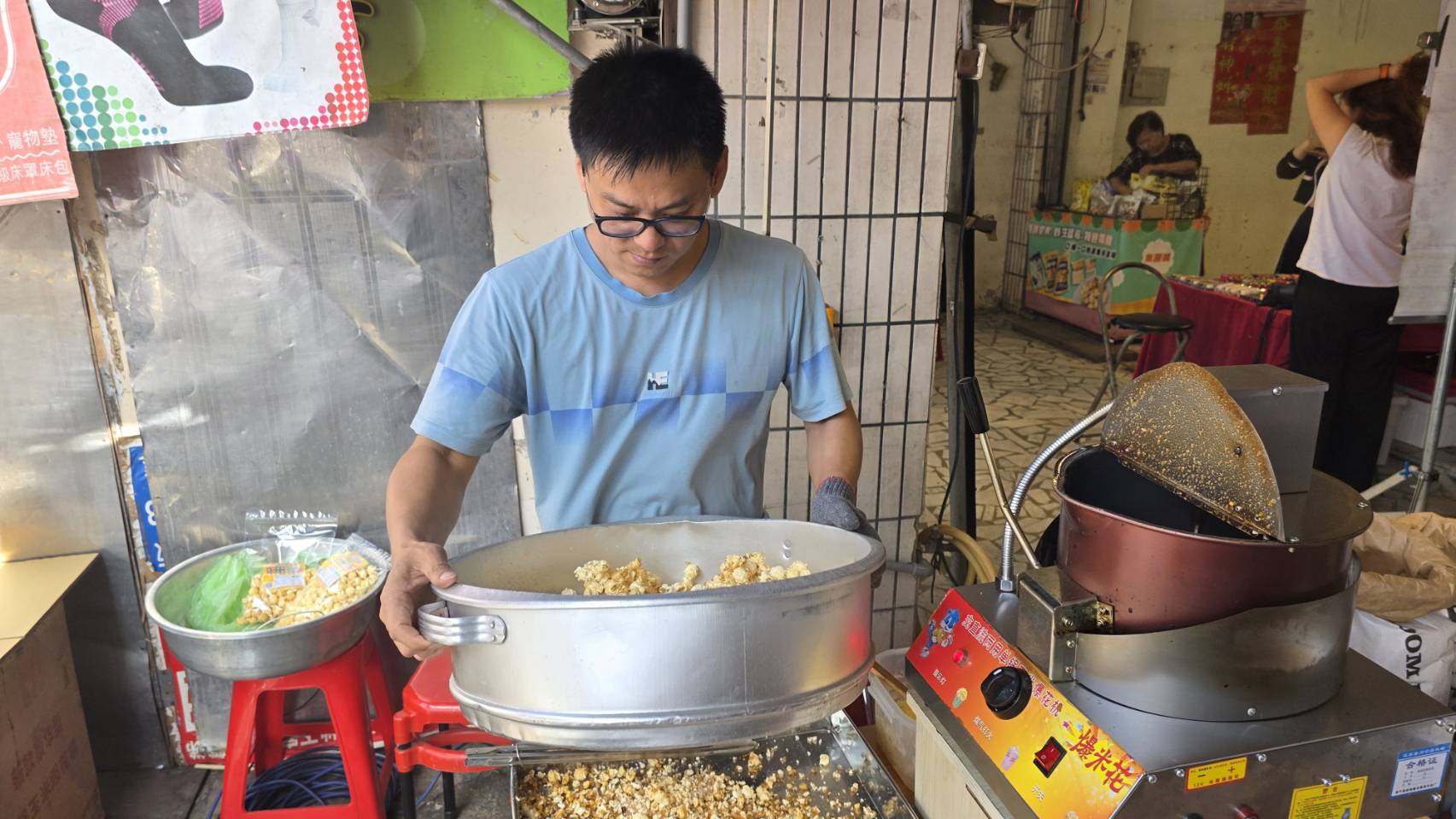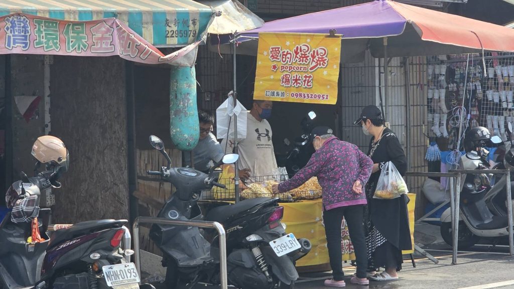 位於崇德市場的『愛的爆爆』爆米花攤有著許多婆婆媽媽擁躉,每到開張總有顧客上門試吃選購。 (記者王勗攝)