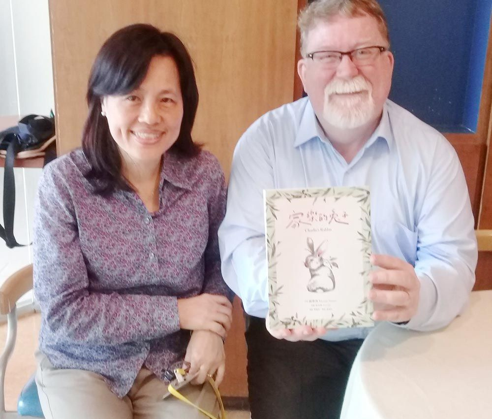 屏東基督教醫院名醫吳蘭香(左)多年前陪同夫婿蘇牧理發表「家樂的兔子」一書,分享部落故事。(記者毛莉攝)