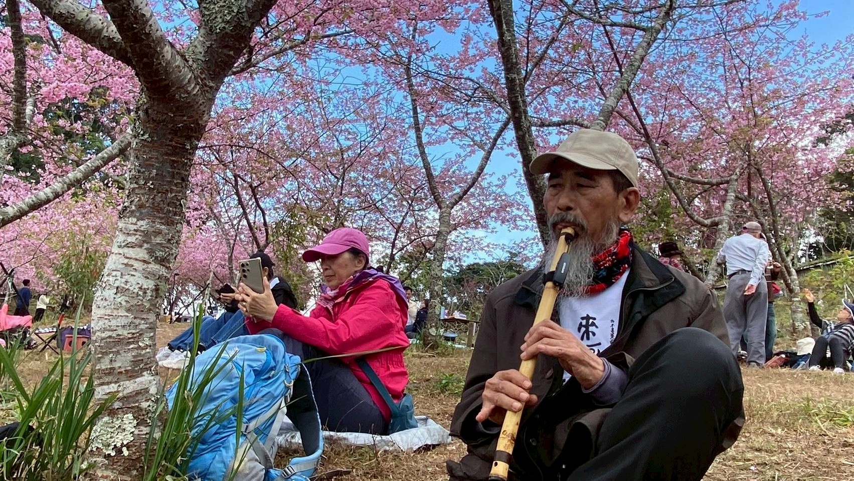 除了書藝,張軻三也以竹子自製各種簫,讓簫聲也成為他的日常,尤其遊山玩水,總愛帶著簫,不論何種情境,總能以簫聲相伴,也分享在山水裡的遊客和旅者,以簫聲寄情。張軻三表示,單騎旅行,隨處皆可至,一機一簫相伴於山水之中,或在花季盛開時節,立於繁花樹下吹奏著簫,很逍遙很自在,更能與賞花者一同分享,讓簫聲隨著花香隨著風傳送,美哉、樂哉當下。