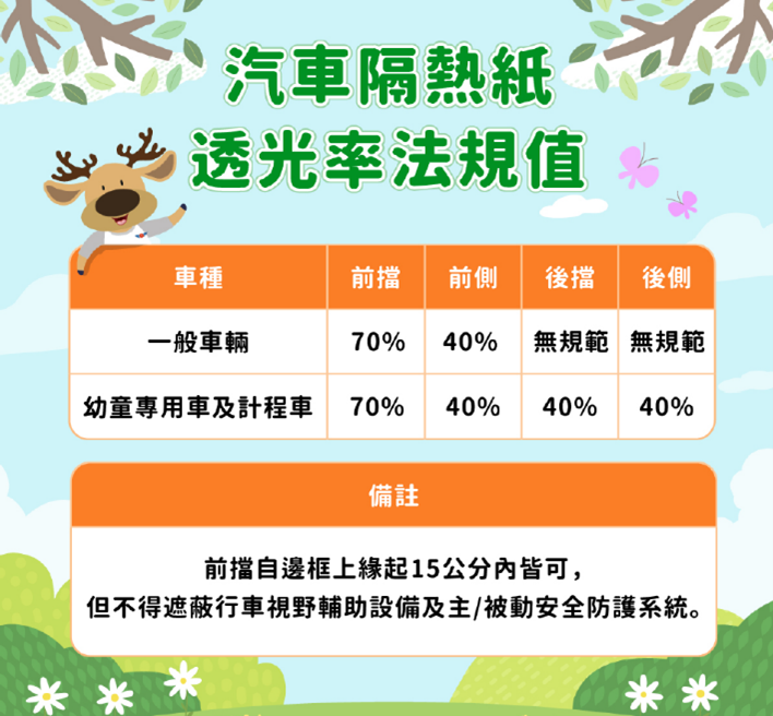 自一一五年二月廿八日起,第一次申領牌照的新車及其後續定期檢驗,開始適用隔熱紙可見光透過率管理新制,一般車輛前擋風玻璃要黏貼可見光透過率七十趴以上、前側窗四十趴以上,且有合格標識的隔熱紙;計程車及幼童專用車的前擋玻璃黏貼七十趴以上、其餘車窗及後擋風玻璃均為四十趴以上透光率,且有合格標識的隔熱紙。