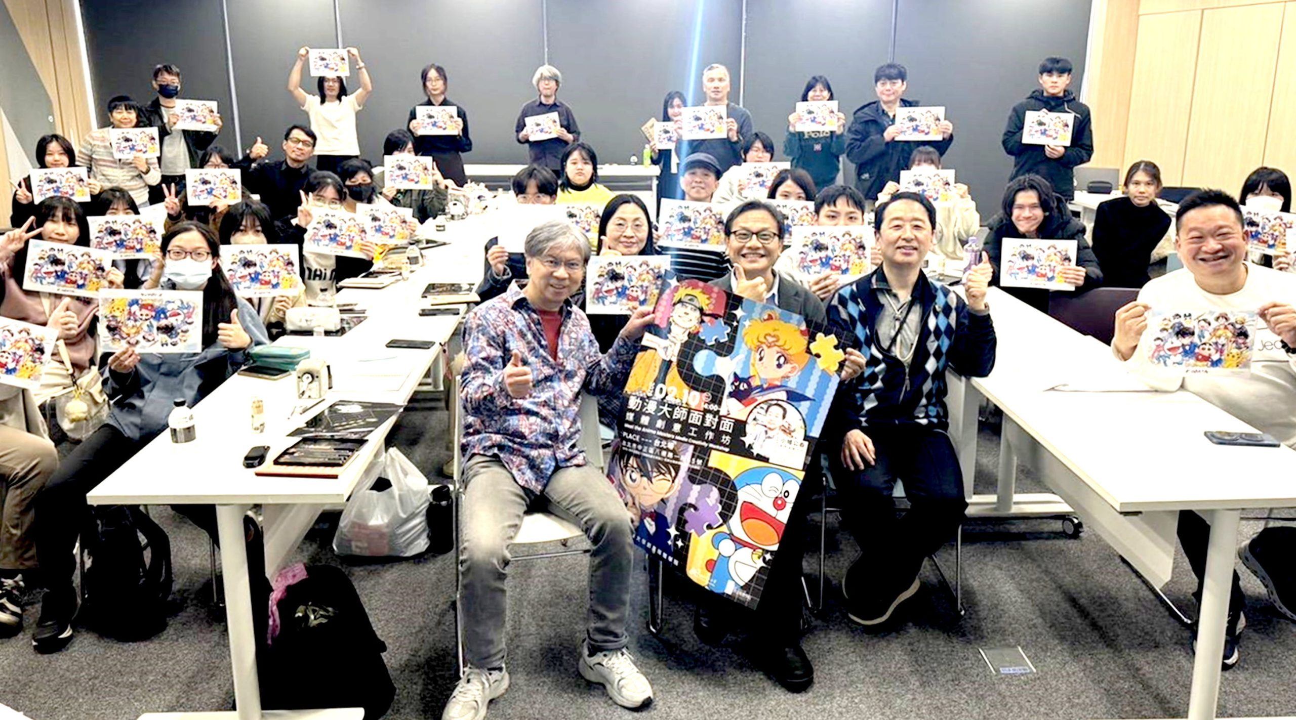 崑大創媒學院在台北希望園區舉辦「動漫大師面對面─媒體創意工作坊」,邀請日本動畫大師小幡公春(前排右)授課,帶領學員進行角色塑造等實作。(崑大提供)
