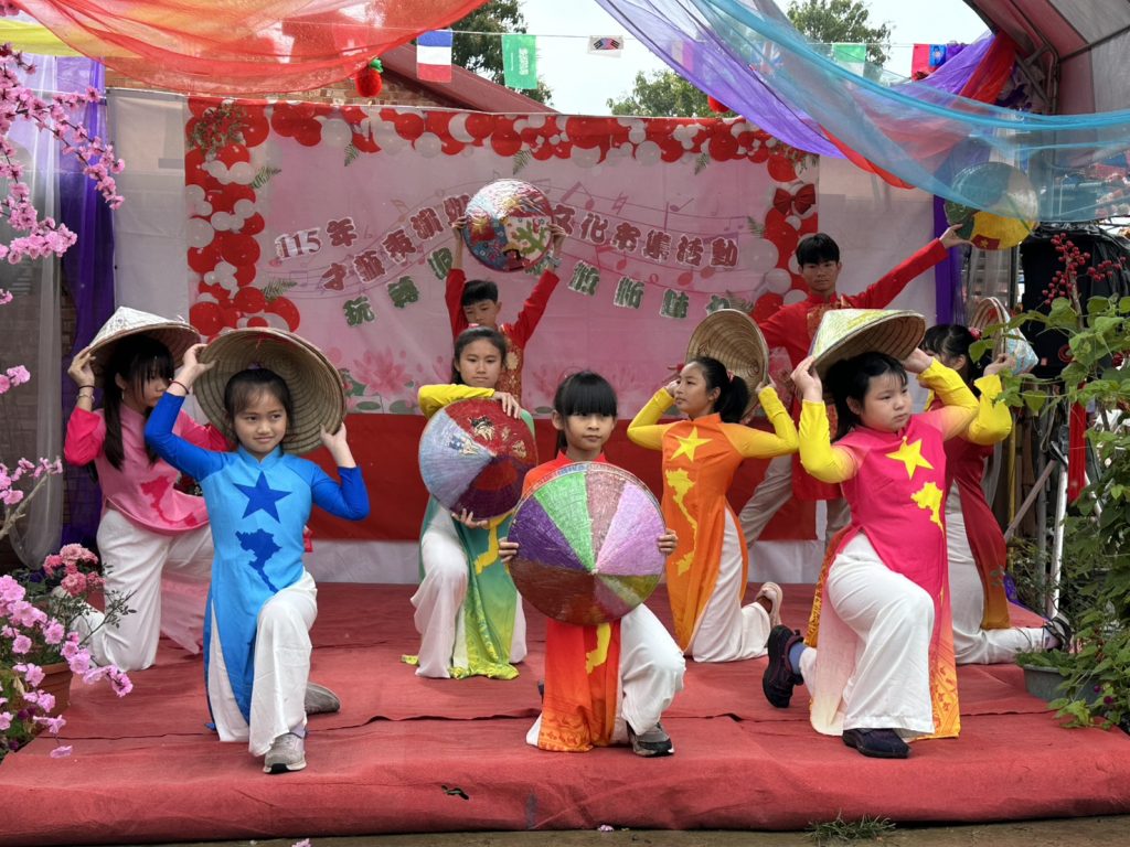 「一襲奧黛,舞動傳承之美」,小小表演者緩步登場,身穿母國傳統服飾、頭戴彩繪斗笠,隨裙襬輕揚,一曲〈哈囉!越南〉呈現南洋風情。