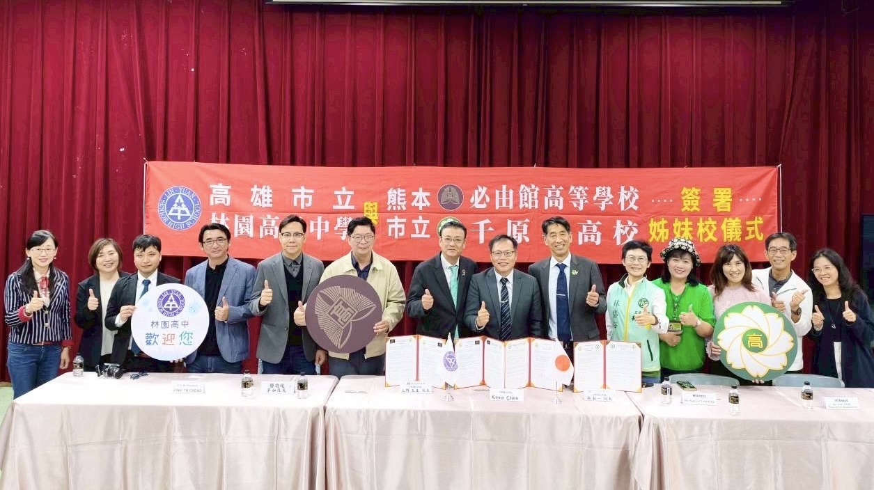 高雄市林園高中與日本熊本市立必由館高等學校、熊本市立千原台高校締結姐妹校,透過跨國教育合作,三校未來將在學生交流、雙語教育、特色課程與文化體驗等面向展開長期合作,為學生打造更多元的國際學習機會,也讓林園在地特色透過教育交流走向國際。