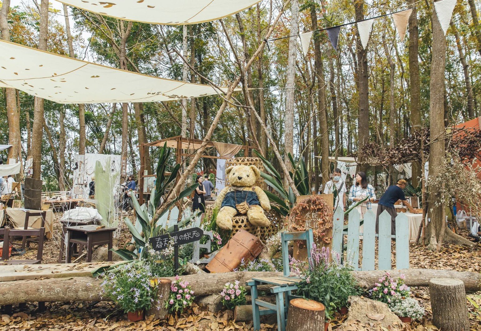 今年「灰熊綠展」主題是「走進森林裡,走在繪本裡」,參展人有一百三十多名創作者,將植物概念創作、植物應用藝術、森林裝置藝術及再生材料創作融入森林地景中,讓藝術作品與自然環境相互呼應。