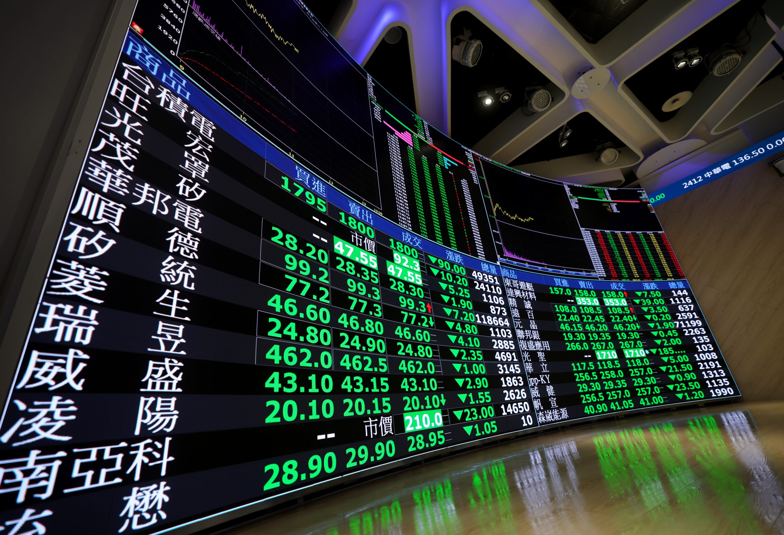 觀察權值股走勢,台積電早盤跌一百二十元回測至一千七百七十元;盤中收斂,終場下跌八十元,收一千八百一十元,跌幅百分之四點二三。鴻海、台達電、國巨、聯發科等權值股收盤重挫逾百分之五。