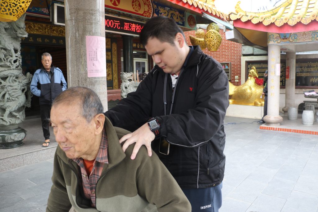 先天視障者呂坤諭幫福久宮的董事長李次雄按摩 力道拿捏令人滿意。(新北社會局提供)