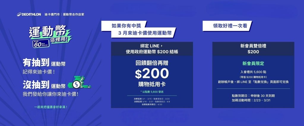 無論有沒有抽中政府運動幣,迪卡儂也大方送出「普發津貼」: 即日起至 3 月 31 日,完成迪卡儂新會員註冊並綁定 LINE,不需抽籤、不需消費,同樣可獲得等值 $200 的購物點數,讓每位民眾都能享受到這波運動紅利。