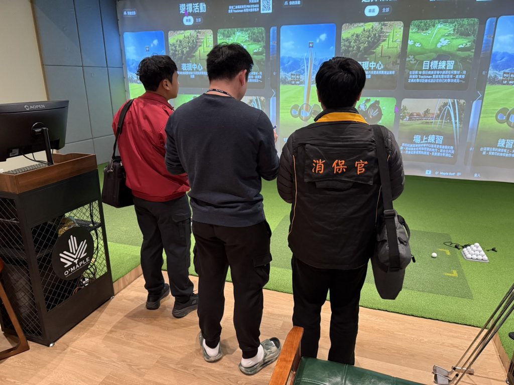 消保官表示,這次室內高爾夫球模擬器練習場稽查主要針對業者「是否投保公共意外責任險」、「定型化契約條款」及「消防安全設備」等項目進行重點查核。